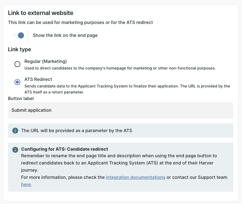In these cases, Harver receives a unique redirect URL per candidate from the ATS. You can only edit the button label, the redirect link is handled automatically in the background.