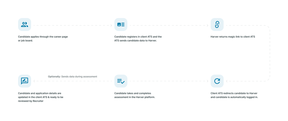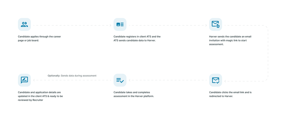 It starts with the candidate first applying and registering in ATS, whereafter ATS will request assessment for a candidate from Harver. The candidate then gets redirected directly from the ATS to Harver and is already logged in and authenticated. They just have to accept terms and conditions and other policies.