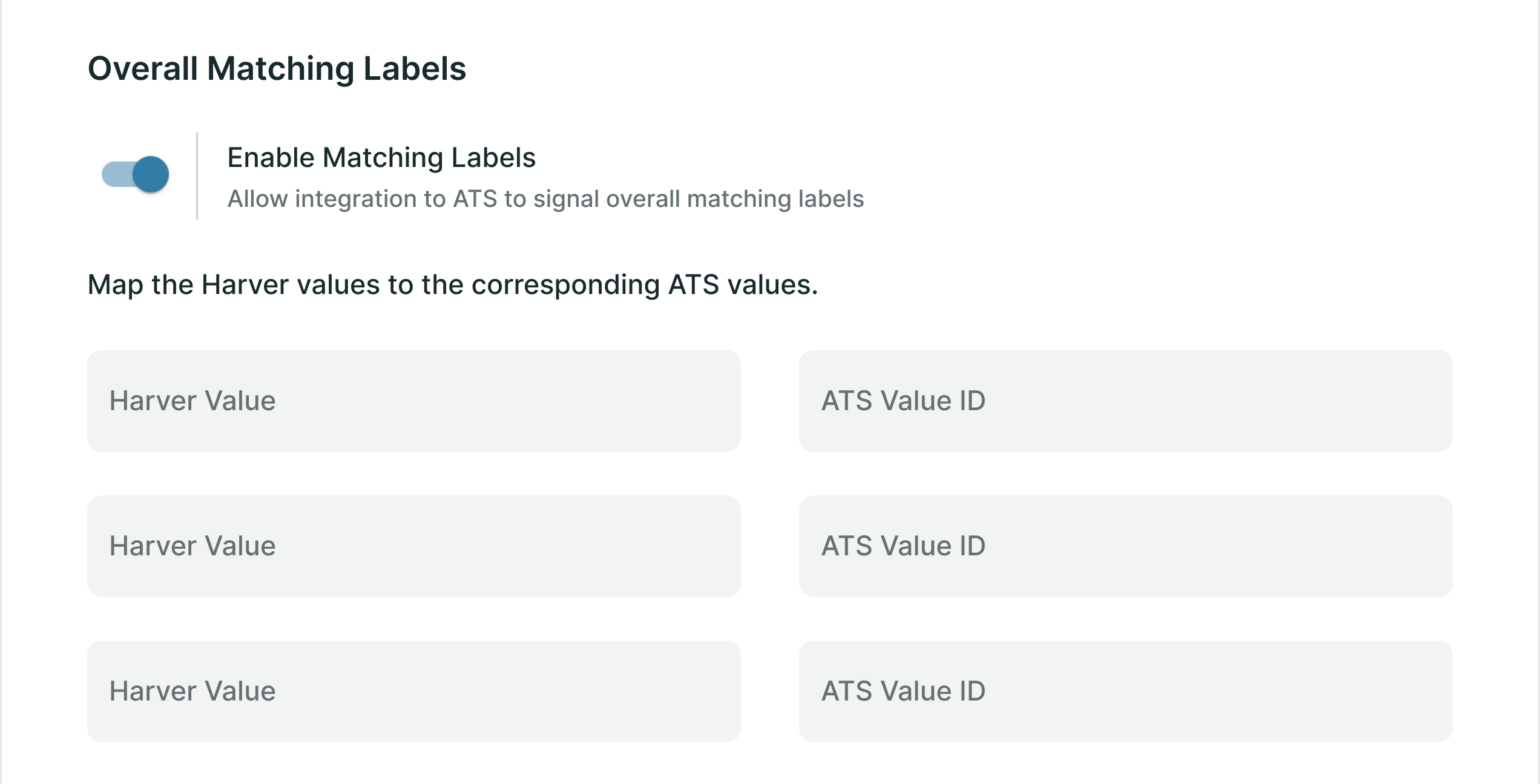 - Get the ATS id values from SmartRecruiters custom fields, add all values here by mapping it to Harver Value, and then enable the matching label toggle.