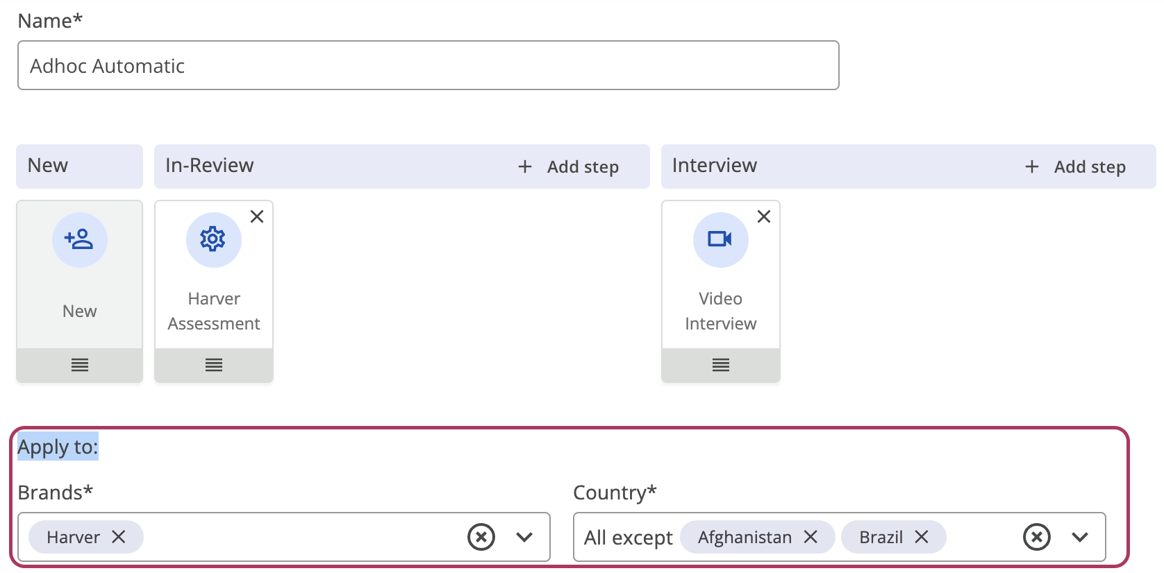 The hiring process workflow is assigned and linked automatically to requisitions based on the Job Fields settings you set in this workflow e.g. below Adhoc Automation workflow will be automatically linked to Jobs which brand is Harver and is NOT based in Afghanistan & Brazil.