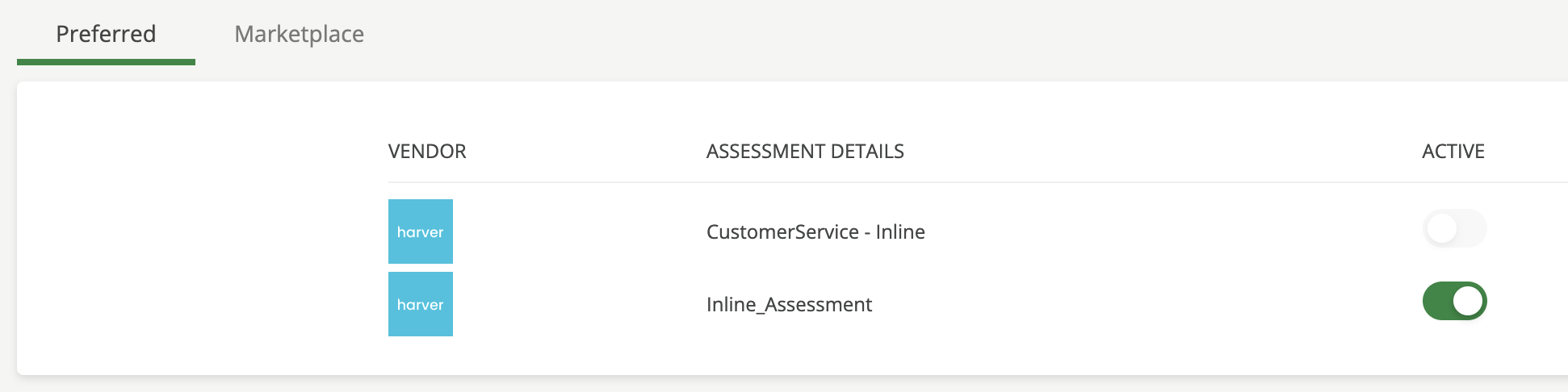 - You will see the list of inline assessment packages from Harver. Activate the inline assessment that is applicable for this hiring process. You can pick only one inline assessment per hiring process.