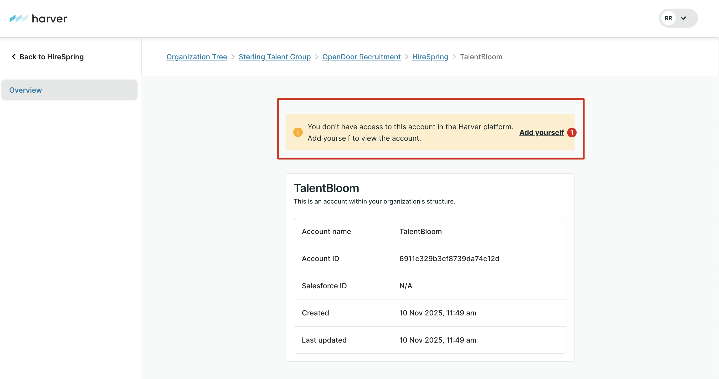 Without being added as an Account User, you can view general account details (if you have Organization-level access) but cannot edit or configure the account’s content.
