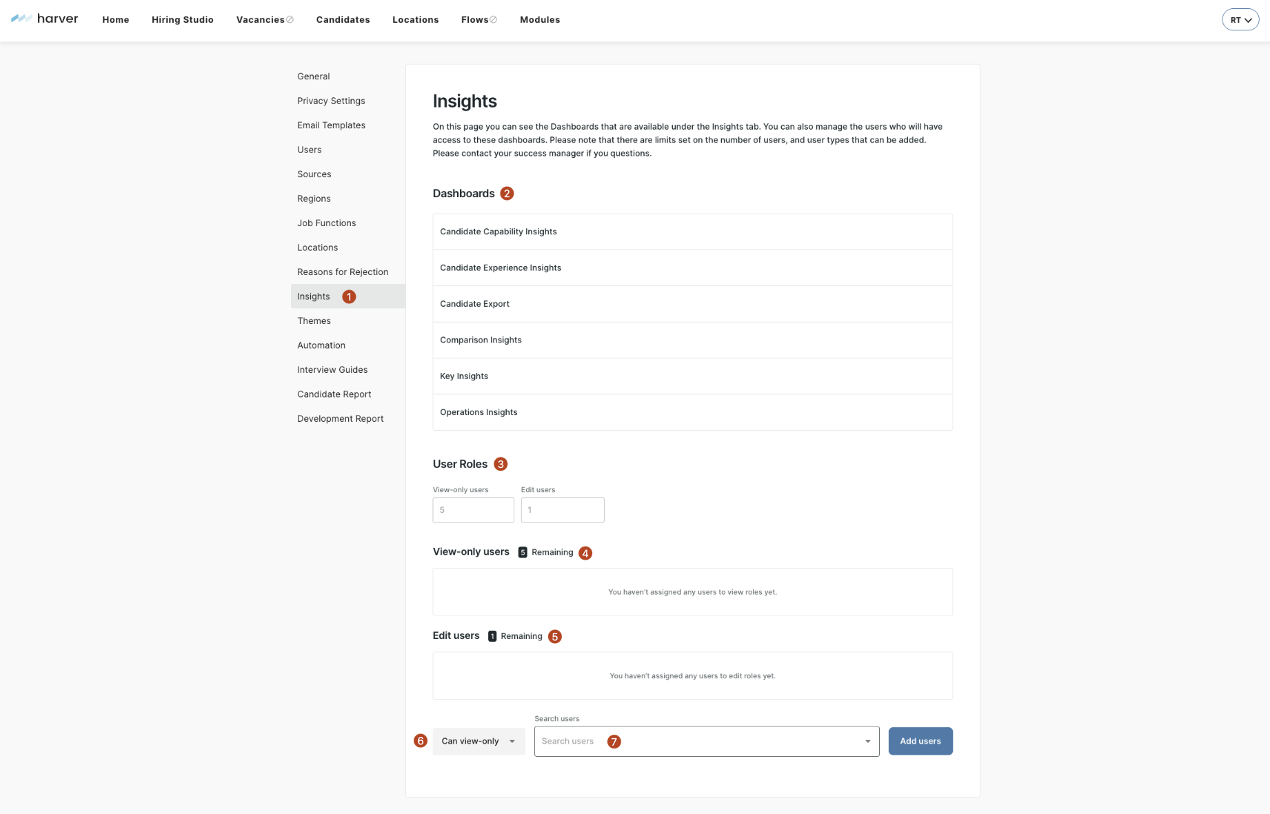 The Insights section provides access to interactive dashboards that display analytical data about candidate performance, hiring efficiency, and platform usage. From this page, you can manage user access to Insights and control which dashboards each user can view or edit.