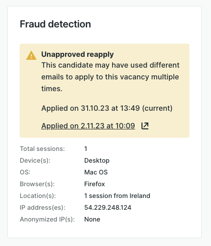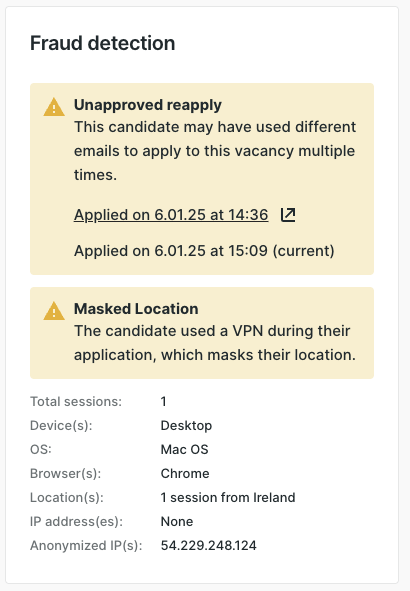 The Application Session Log is a standalone feature that surfaces key parameters about each candidate session. Customers can manually review these parameters or cross-reference them with internal fraud or security systems.