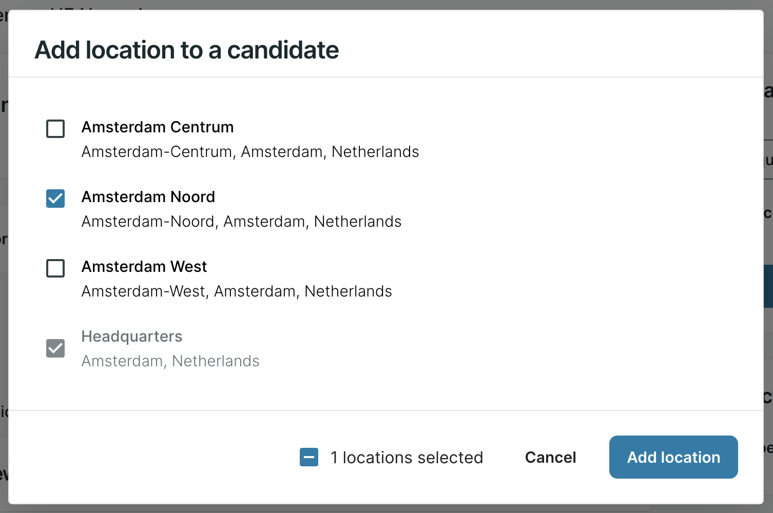 Recruiters can also manually add additional locations to a candidate when needed—for example, in multi-location hiring scenarios where multiple stores or offices may want to consider the same applicant.
