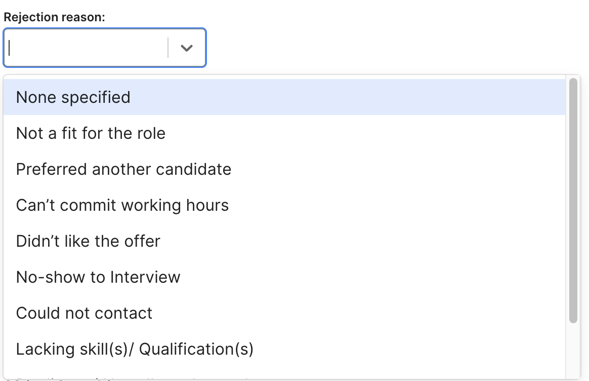 When Rejection Reasons are configured for an account, recruiters are required (or optionally allowed, depending on your setup) to select a reason when rejecting a candidate. Reasons are created/managed by Account Admins.