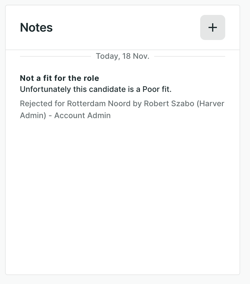 The selected reason and any notes are recorded automatically and shown in the Candidate Details Page (CDP) under the Notes section.