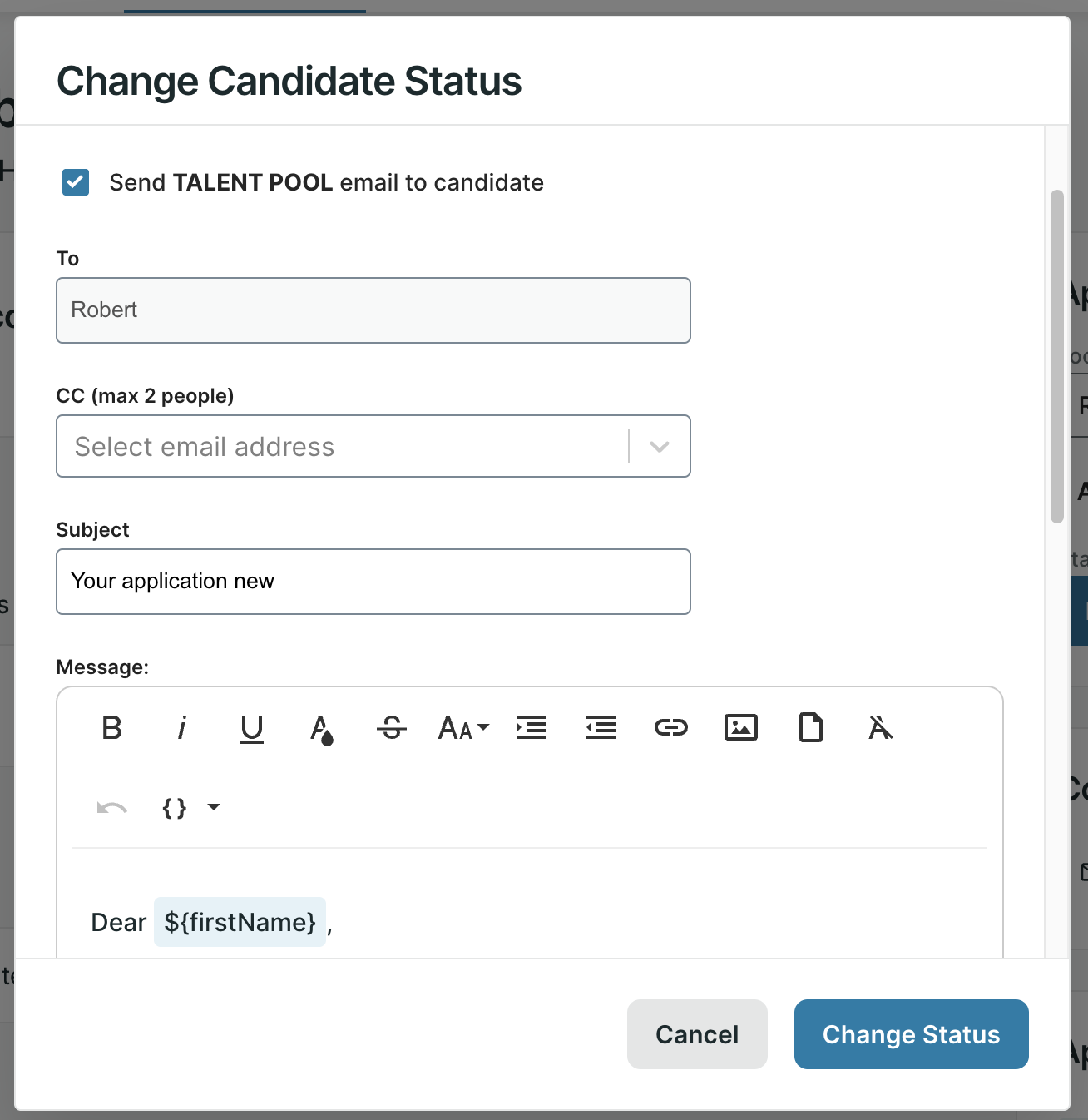 When changing a candidate’s status, recruiters have the option to send an email notification to the candidate.