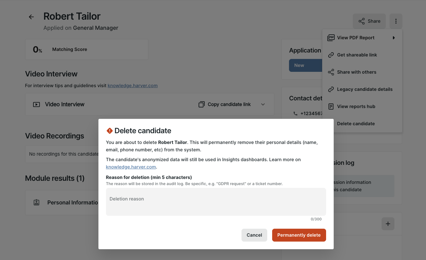 ⚠️ Important Deletion is permanent and cannot be undone. All personally identifiable information (name, email address, phone number, etc.) will be removed from the system. The candidate record will become unreachable. Anonymised statistical data will be retained and will continue to appear in Insights dashboards.